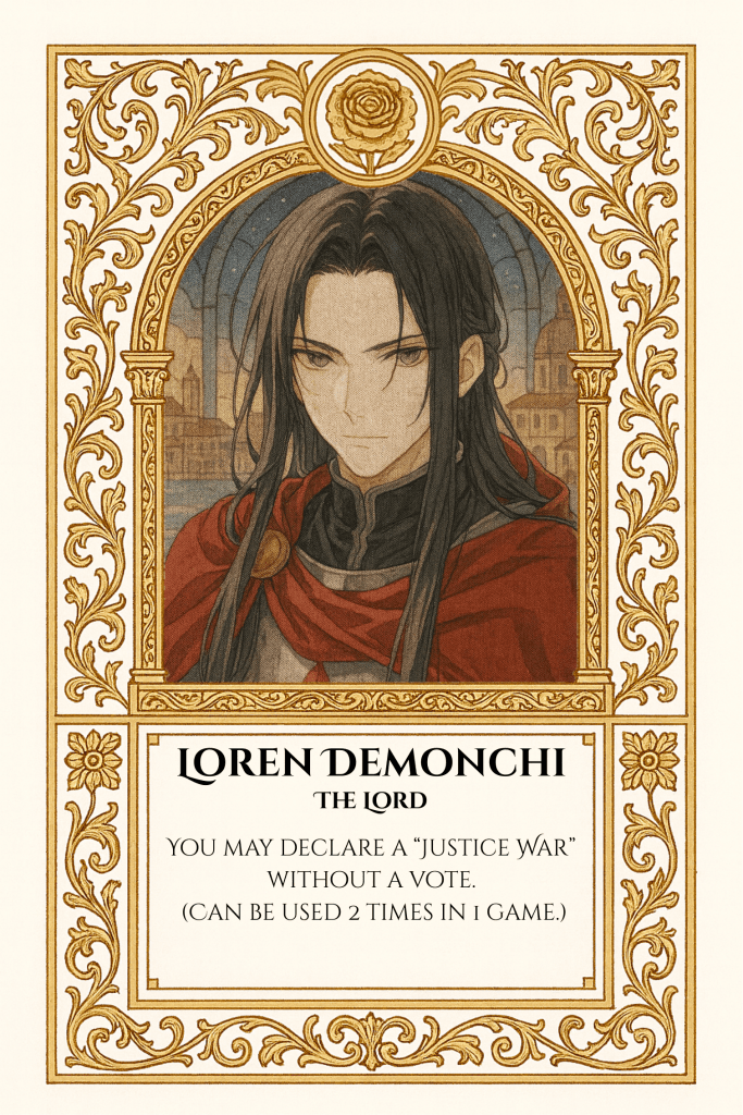 You may declare a “Justice War” without a vote. (Can be used 2 times in 1 game.)