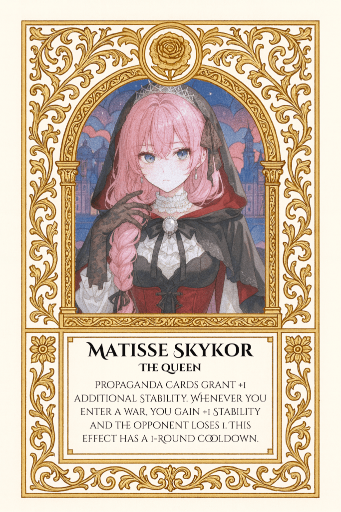 At the age of seventeen, the young Countess Matisse escaped with the help of a mysterious traveler named Sain. Together they crossed the Genesis Mountains and reached the lands that would later become known as Skykor. There, blessed with abundant magical resources, Matisse gathered followers and founded a new realm. In time, those who followed her proclaimed her the Queen of Skykor.